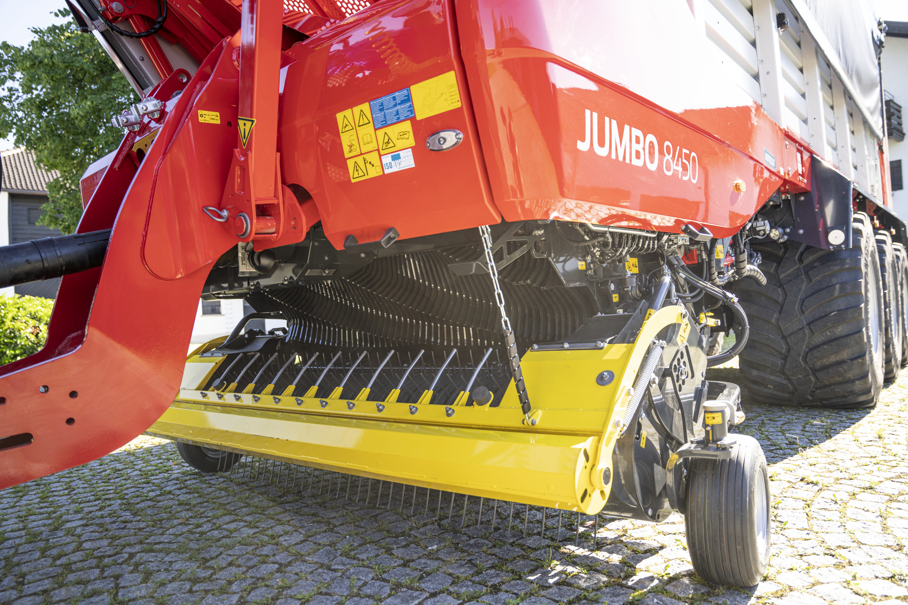 Широкий подборщик JUMBO объединяет чистоту подбора без потерь за один проход и удобство в езде и управлении. Ведение подборщика, расположенного в середине, выполняется посредством расположенных по обеим сторонам стальных направляющих дорожек. Благодаря огромной ширине захвата 2.300 mm по DIN для него не существует слишком широких валков. Увеличенная производительность погрузки позволяет чисто и эффективно подбирать даже валки после измельчителя.