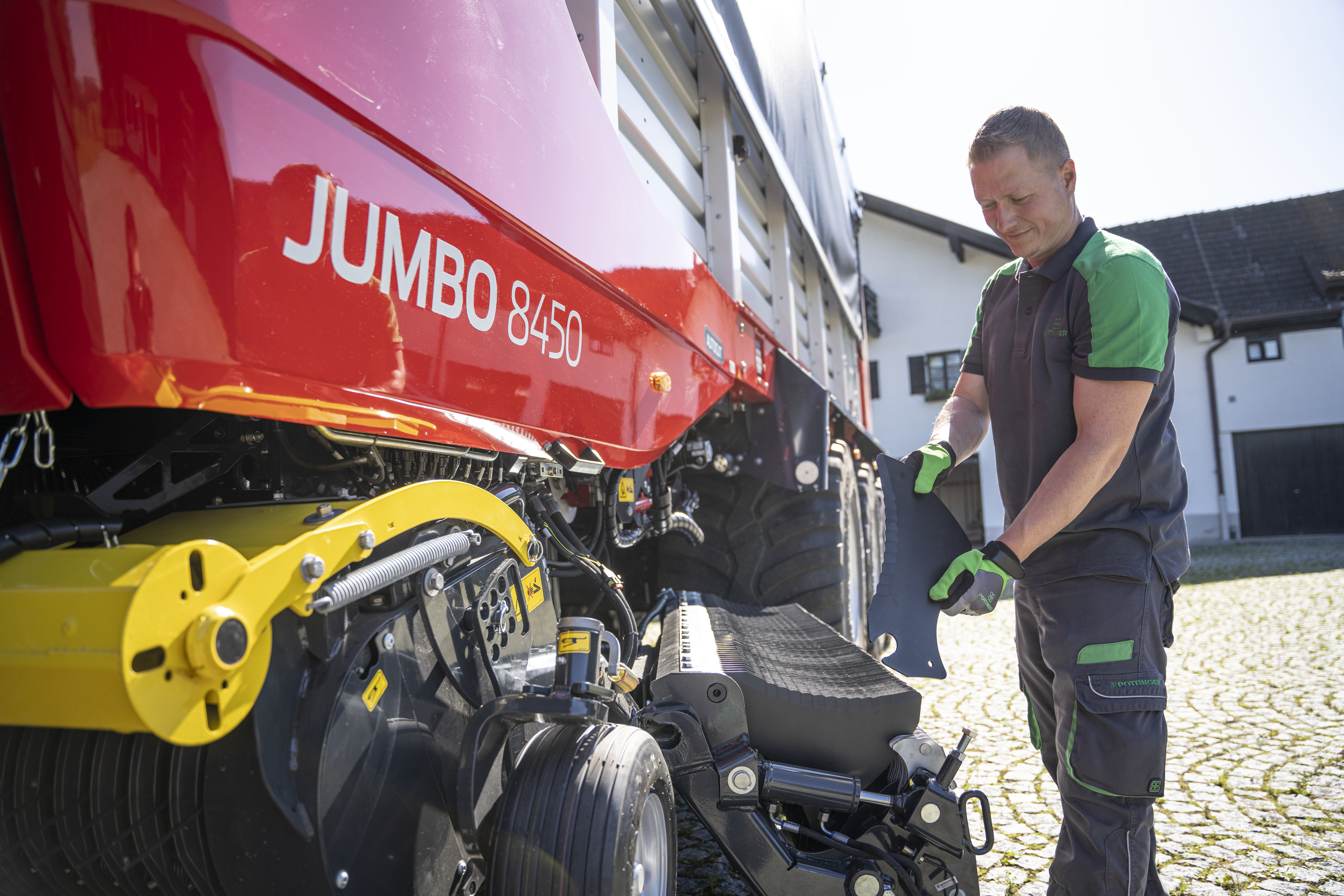 Сняв подборщик, можно уменьшить собственный вес JUMBO примерно на 520 кг для использования в качестве транспортного средства. Это значительно увеличит полезную грузоподъемность. В сочетании с дополнительным копирующим роликом, устанавливаемым как опция, можно снизить вес даже на 580 кг.