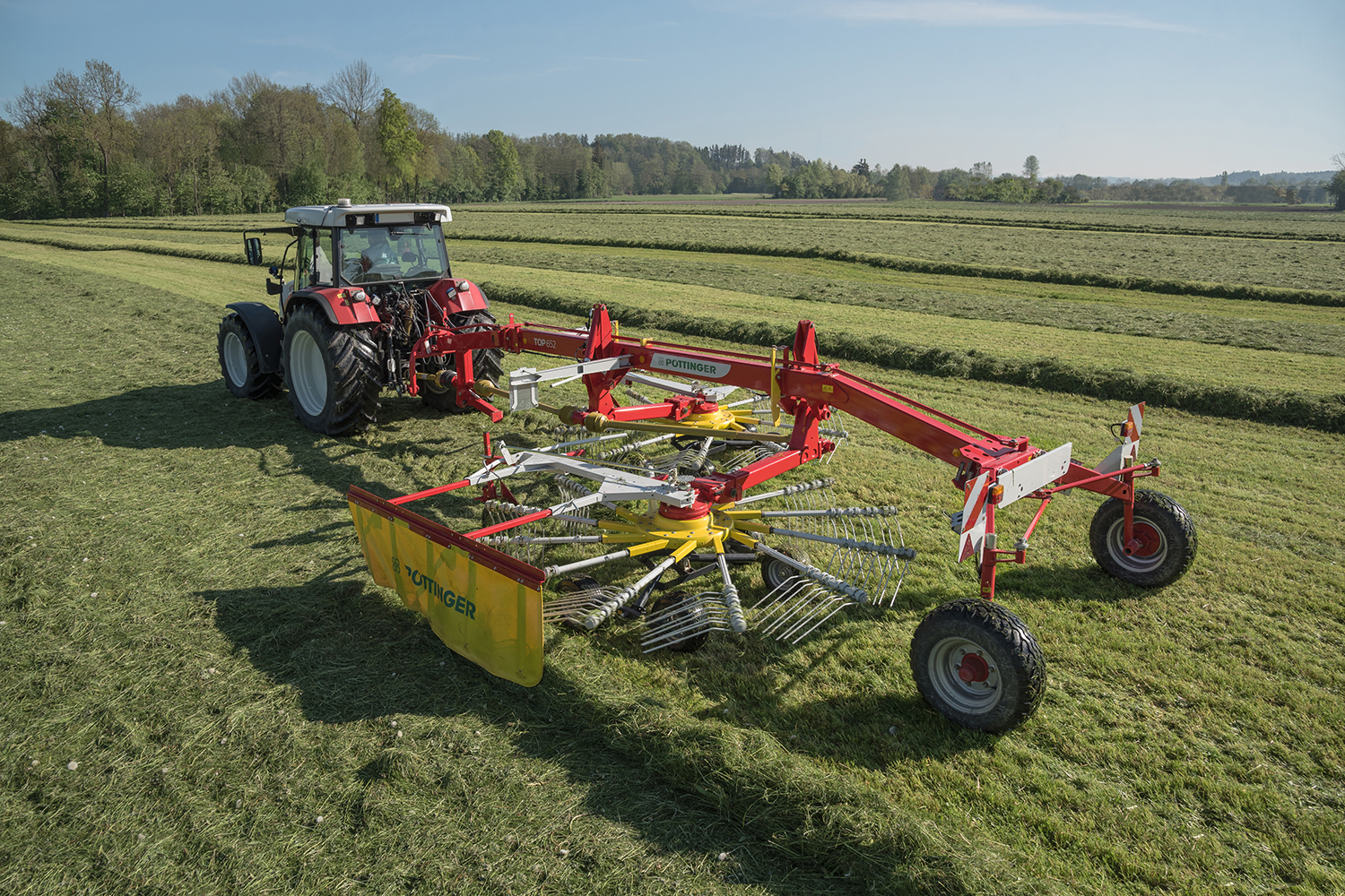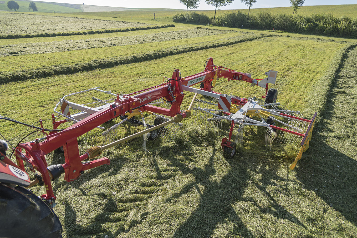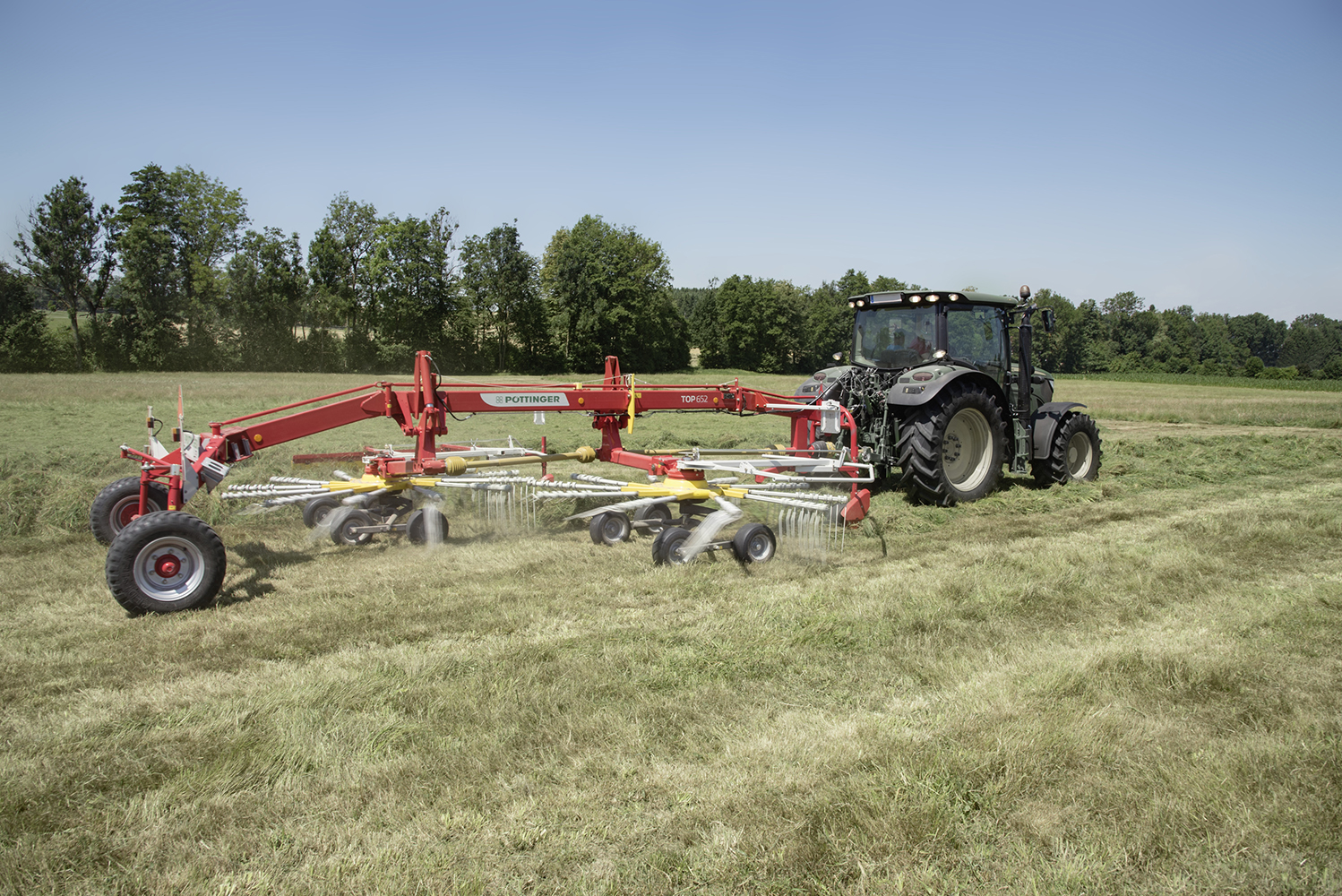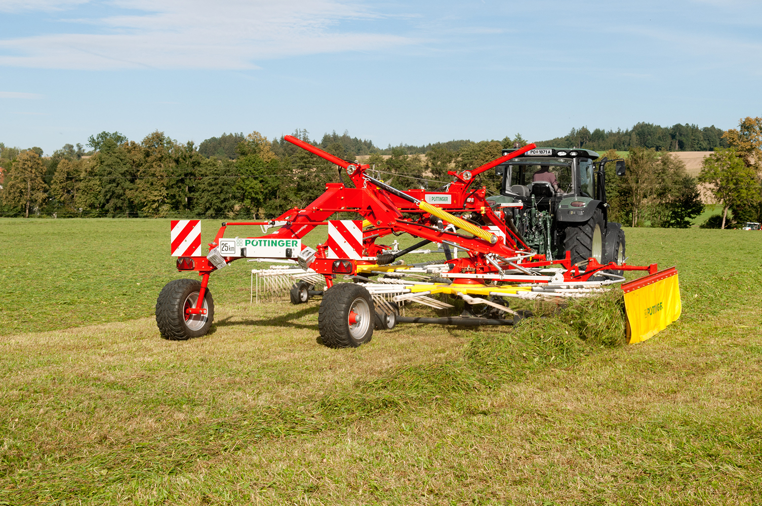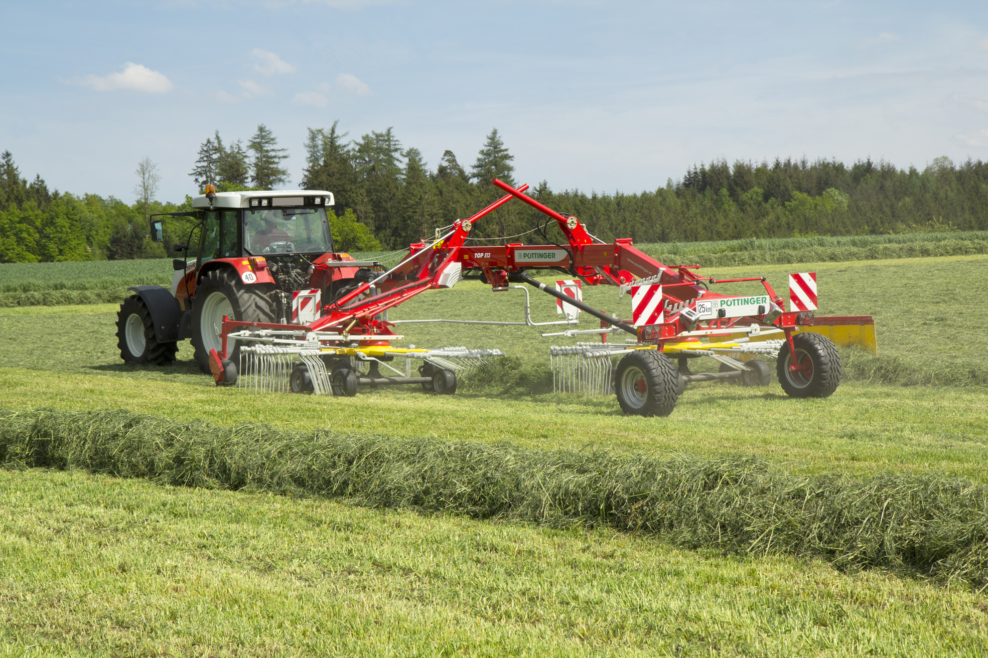 С валкообразователями PÖTTINGER мы гарантируем чистый корм в любых условиях: наши машины работают точно даже при малом количестве листовой массы или при сборе тяжелого мокрого корма. Важную роль при этом играет копирование поверхности поля. Колеса тандемной оси TOP расположены на очень большом расстоянии друг от друга и максимально приближены к граблинам. За счет этого наши валкообразователи оптимально адаптируются ко всем неровностям поля и прекрасно подходят для работы на склонах.